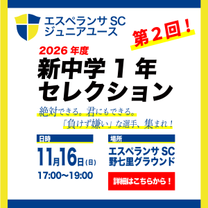 Latest Match 2025.9.28 [Sun] vs COEDO KAWAGOE F.C 1 – 1 試合レポート 試合日程・結果をみる NEWS 2025年10月9日 アカデミー情報 【セレクション】第2回・2026年度エスペランサSCジュニアユース新中学1年生セレクションのご案内 2025年7月9日 アカデミー情報 【体験練習会】2026年度エスペランサSCジュニアユース新中学1年生練習会のご案内 2025年7月9日 アカデミー情報 【セレクション】2026年度エスペランサSCジュニアユース新中学1年生セレクションのご案内 2025年6月17日 スクール情報 エスペランサSCサッカースクール「夏期限定特別コース2025」実施! 2025年4月21日 NEWS 株式会社三春情報センター代表取締役 春木磨碑露氏、株式会社LILY代表取締役 長尾大輔氏がオルテガ株式会社の社外取締役に就任 2025年3月11日 スクール情報 エスペランサSCサッカースクール「春のキックオフ・キャンペーン2025」実施中! 2024年12月12日 スクール情報 エスペランサSCサッカースクール「冬期限定特別コース2024」実施! 2024年10月29日 アカデミー情報 【セレクション】2025年度 エスペランサSCトップチーム セレクション開催のご案内 ニュース一覧をみる