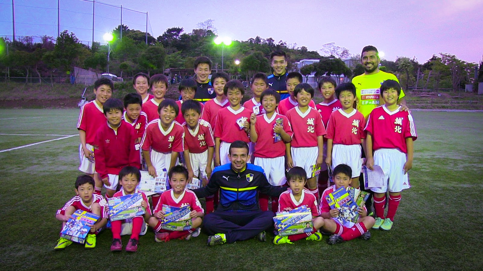 野七里の人工芝グラウンドにて、サッカークリニックを行い、楽しい時間を過ごすことができました。最後には3チームに分かれての試合。アグスティン選手や井上海希選手もチームに加わって、白熱した戦いを繰り広げていました。