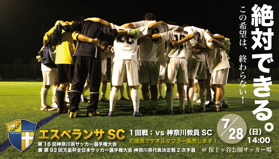 エスペランサSCは、1回戦7月28日(日)14:00から保土ヶ谷公園サッカー場にて、神奈川教員SCと対戦します。神奈川教員SCは関東リーグに所属する強豪です。ぜひ、エスペランサ・ファミリーの皆さんは保土ヶ谷公園に集結して心を一つにし、熱い応援で一緒に戦って勝利をつかみましょう!!