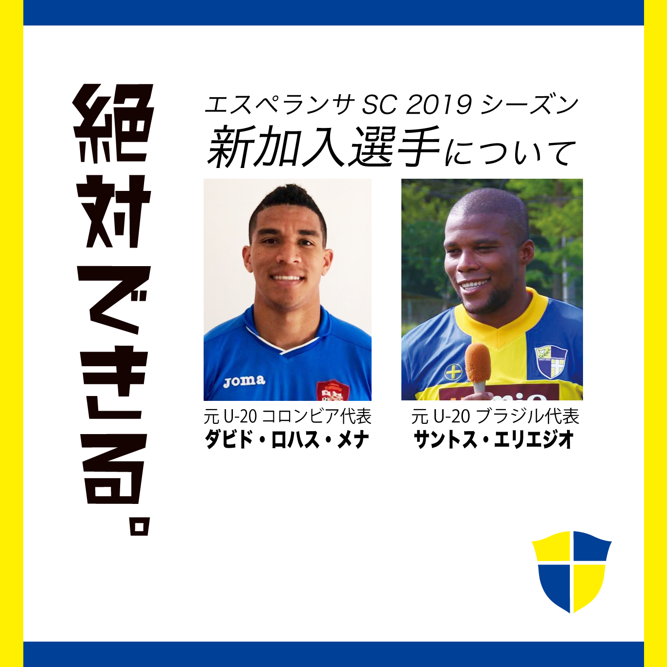エスペランサSCは2019シーズンの新加入選手として以下の2名を獲得いたしましたので、報告致します。