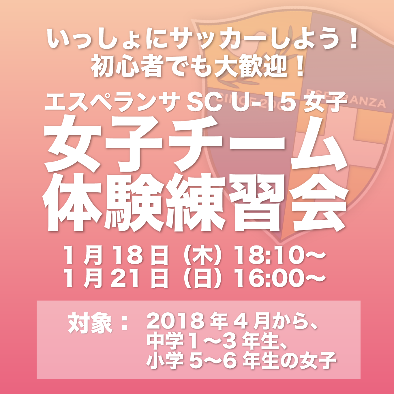 エスペランサSC女子チームに関心のある、中学1〜3年生、または小学5〜6年生の女子。