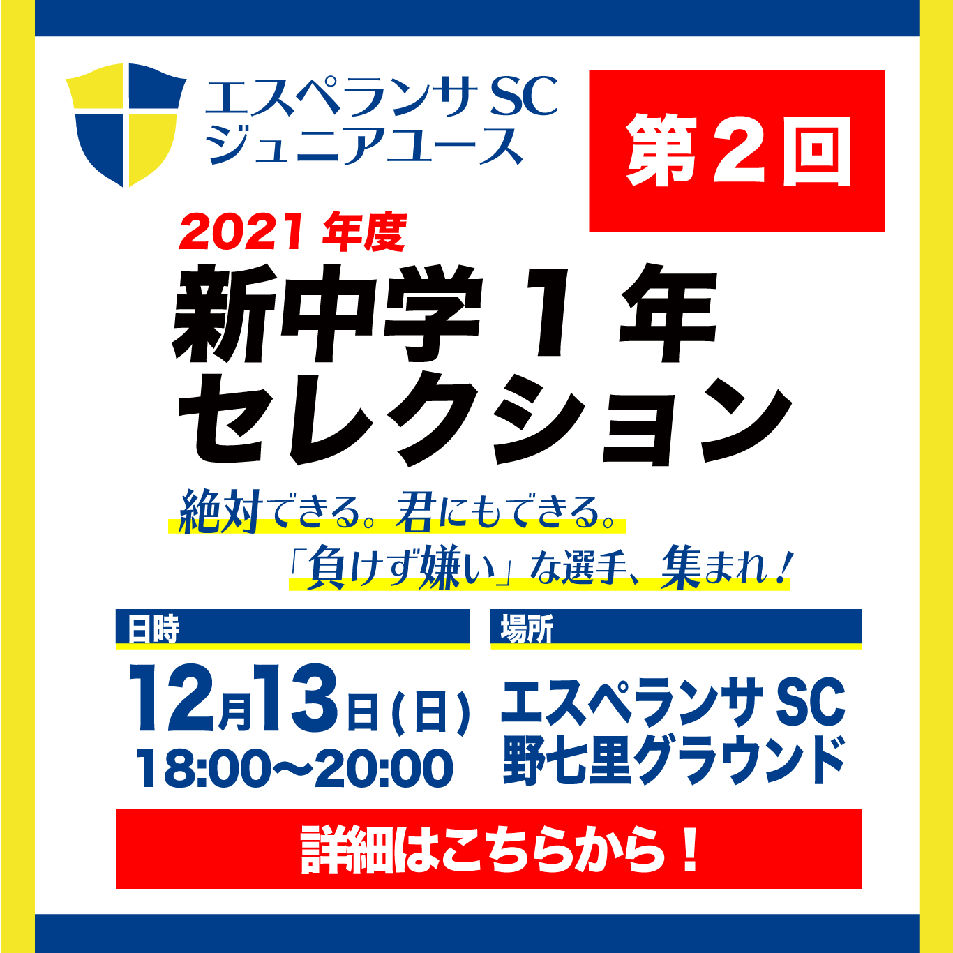 第2回、2021年度エスペランサSCジュニアユース新中学1年生セレクションを開催します。詳細は以下の通り。体験練習会についても後述します。
