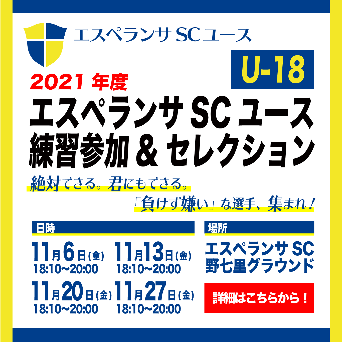 2021年度エスペランサSCユースの練習参加&セレクションを開催します。詳細は以下の通り。