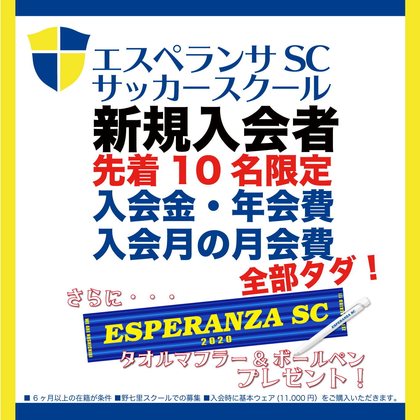 エスペランサSCサッカースクールでは、先着10名限定で、野七里スクールの入会金、年会費、入会月タダ!のキャンペーンを実施します!!